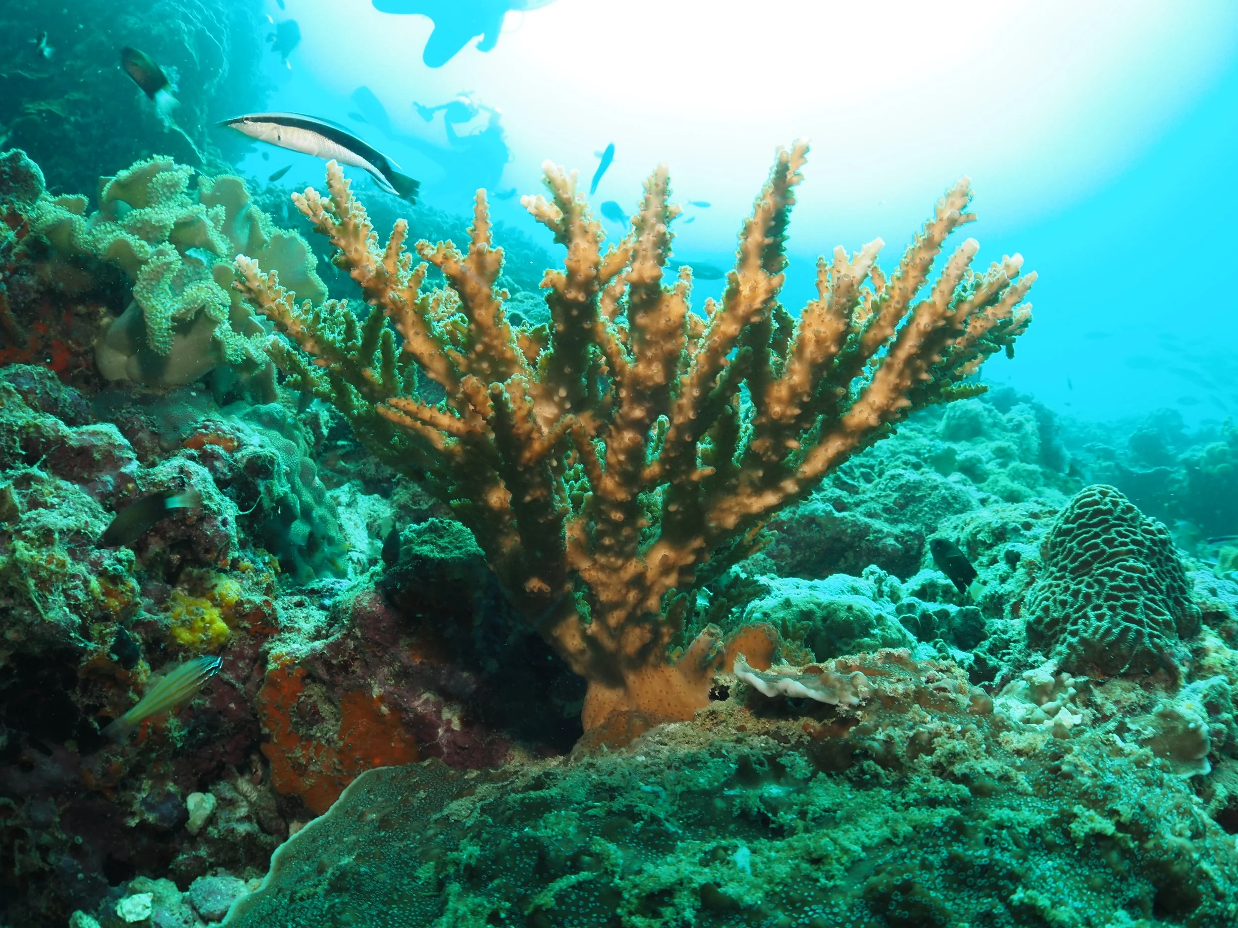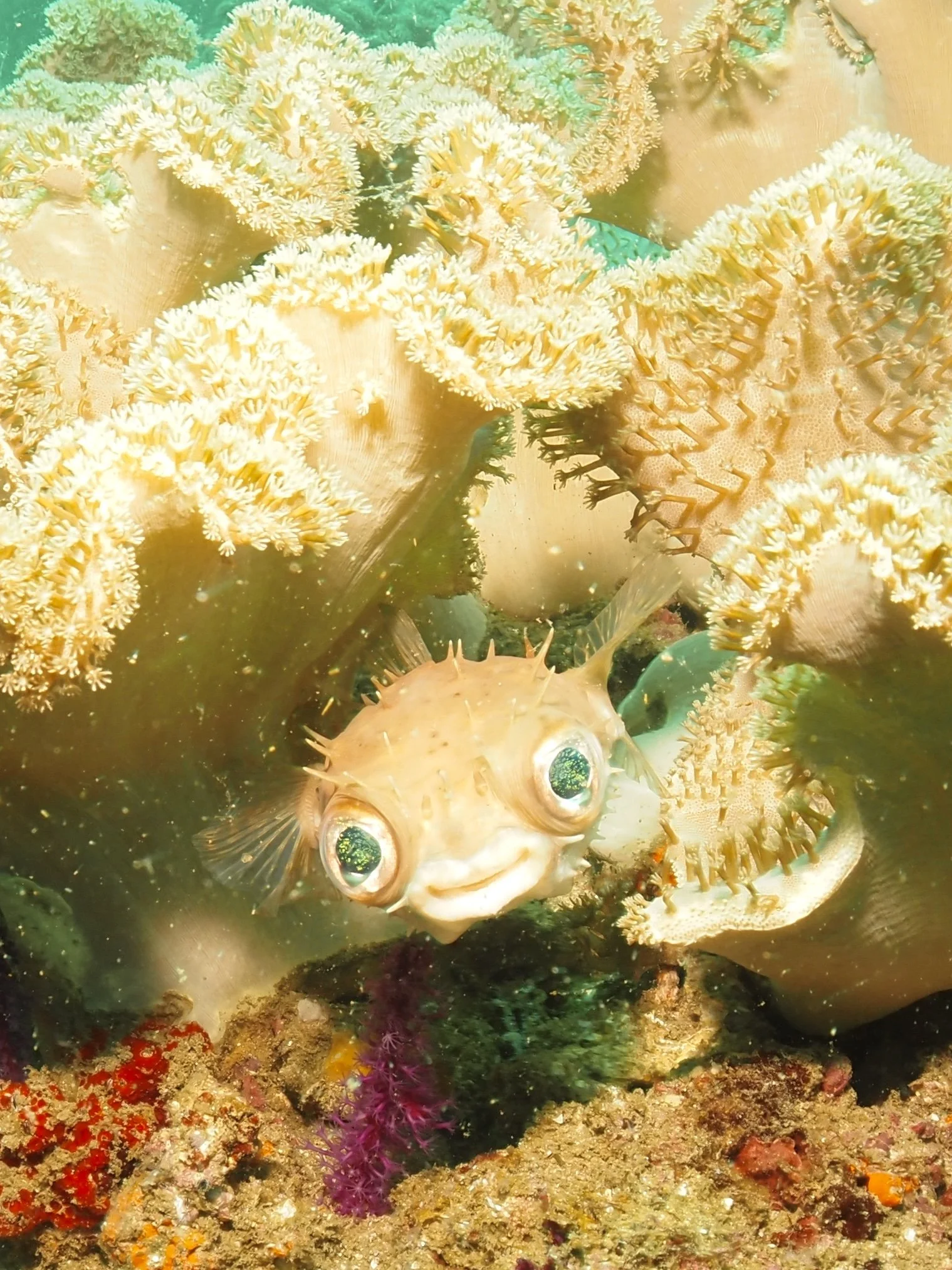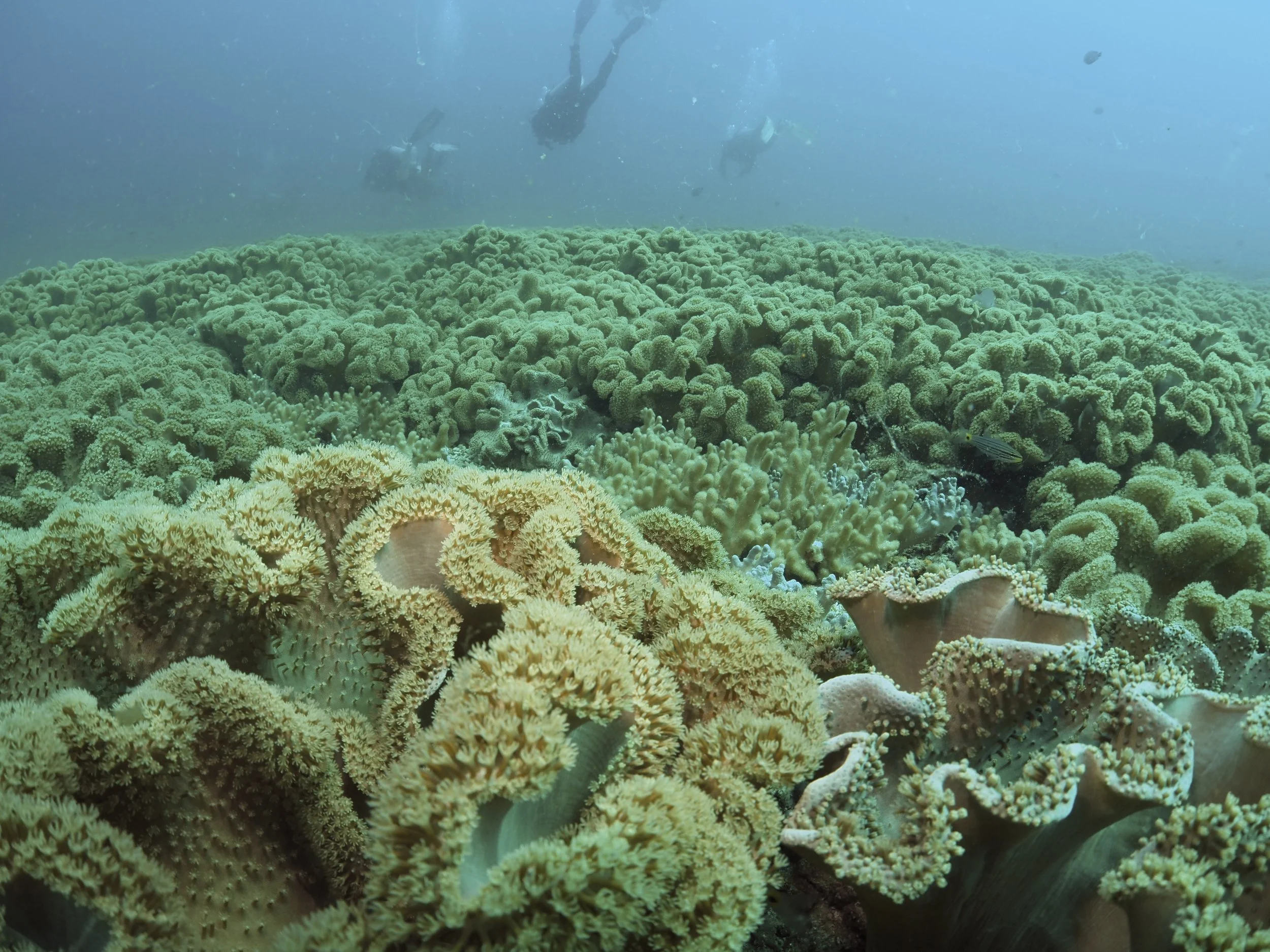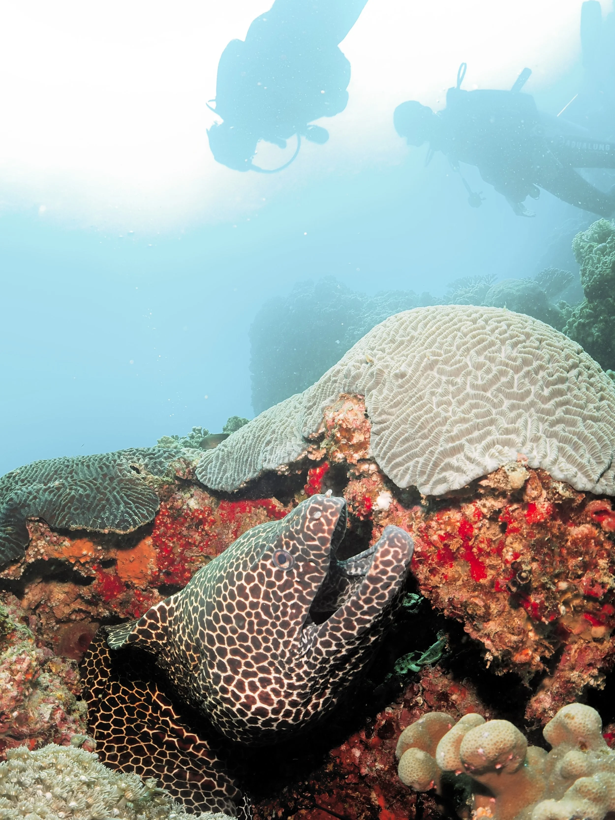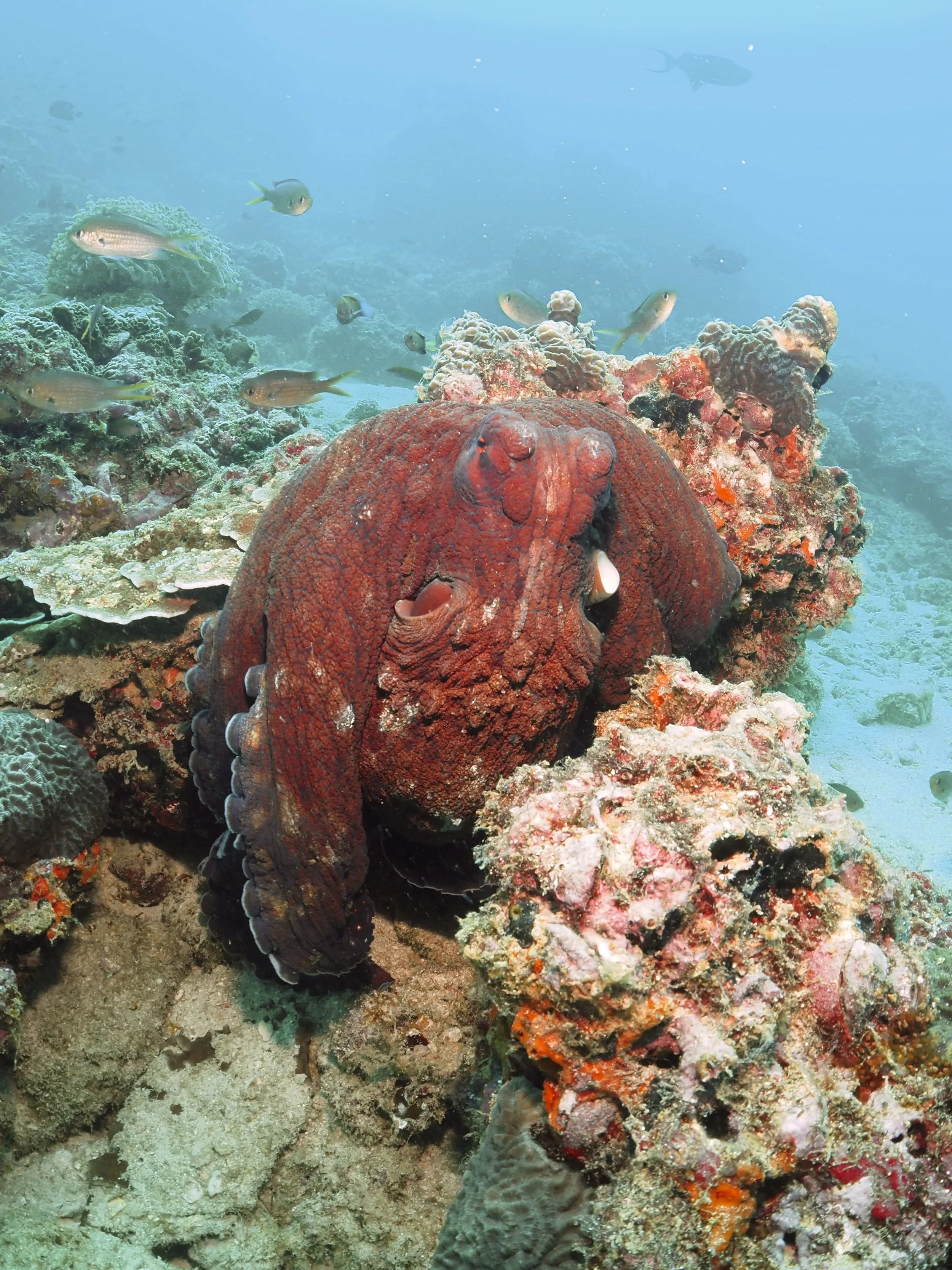 The Islands are a striking barren rocky landscape, with bright white sand beaches nestled in little coves (reminding me a little of the Galapagos Islands). These numerous coves provide calm waters for the snorkel and novice dive experiences. My first dive was in one of these coves at a site called Black Tip in the Eastern Islands. It was actually my favourite dive of the 4 that I did. The dive starts off in the sheltered shallows, then heads a little deeper towards the outside of the cove. I was pleasantly surprised by the healthy live coral coverage, expansive soft coral gardens, and tons of fish including schooling snapper, and several octopus. The other dives I did over the 2 days were Noodles (Eastern Islands), and Sierra and Walid Junn (Western Islands). The boat entry and exit at the Western Island dive sites were a lot more exposed, and with the swell on those days it made getting back on the boat a bit more difficult. Although not as much live coral cover at these other 3 sites, there was still plenty of fish life to see including schooling catfish, some large pufferfish, lionfish, scorpionfish, morays and plenty of reef fish. There was even a few cheeky appearances by sea turtles at Walid Junn, and surprisingly many octopus sightings at all the sites - including one walking out in the open, fending off attacking damselfish! I had hoped to see whale sharks and leopard sharks on this trip. With the swell crushing my chances with the whale sharks, I was holding out hope for a leopard shark and dutifully checked under rocky overhangs and behind boulders as I cruised over the seabed. But, it seems the leopard sharks are a bit more elusive than you’d hope. Our dive boat was split in to 3 groups of divers (~4 divers per group with 1 divemaster) and the group in front of mine spotted a leopard! But sadly, it had scarpered before we reached that point. Here’s your friendly reminder to please respect the wildlife and resist the urge to stick your GoPro in their face! This way, they may stick around for other divers to enjoy them (from a distance).